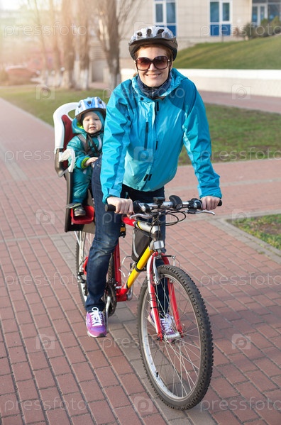 Молодая женщина с сыном на велосипеде