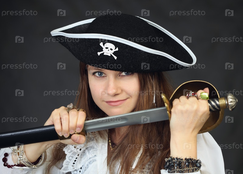 Портрет женщины - пирата, получающего меч из оболочки