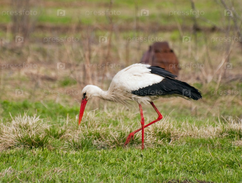 Белый аист кормится среди первой зеленой травы