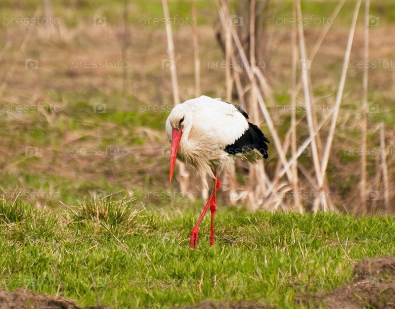 Белый аист кормится среди первой зеленой травы