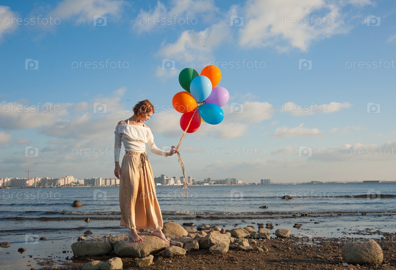 Девушка с воздушными шарами на берегу