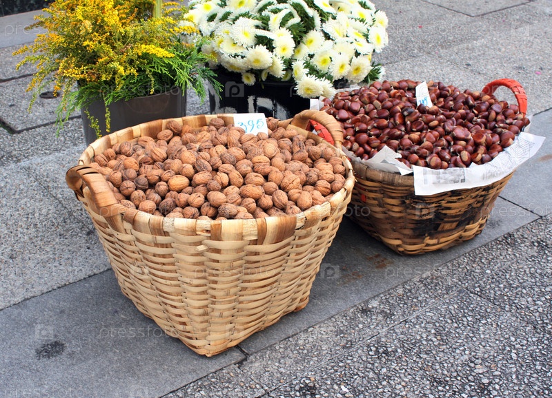 Грецкий орех и каштаны в корзинах