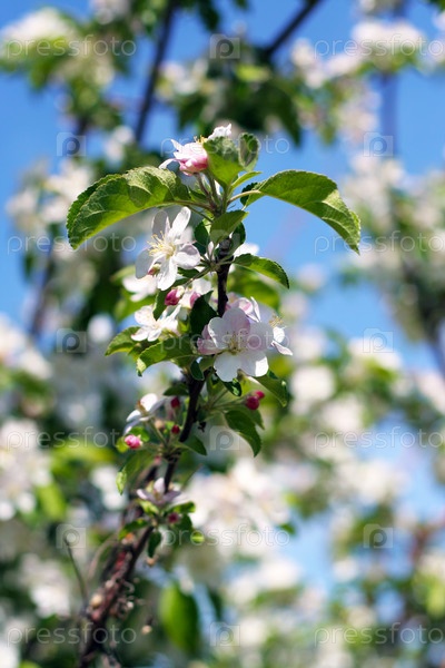 Цветущая яблоня на фоне голубого неба
