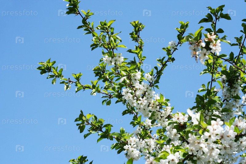 Цветущая яблоня на фоне голубого неба