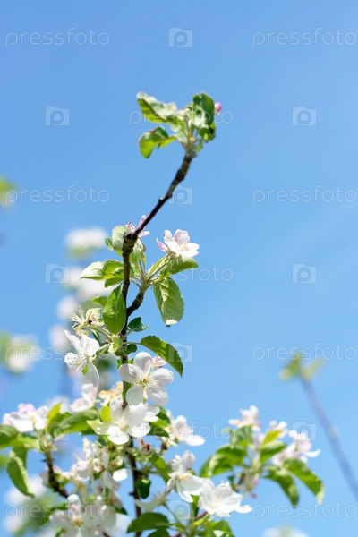 Цветущая яблоня на фоне голубого неба