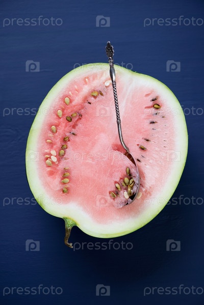 Половинка арбуза, темно-синий деревянный фон