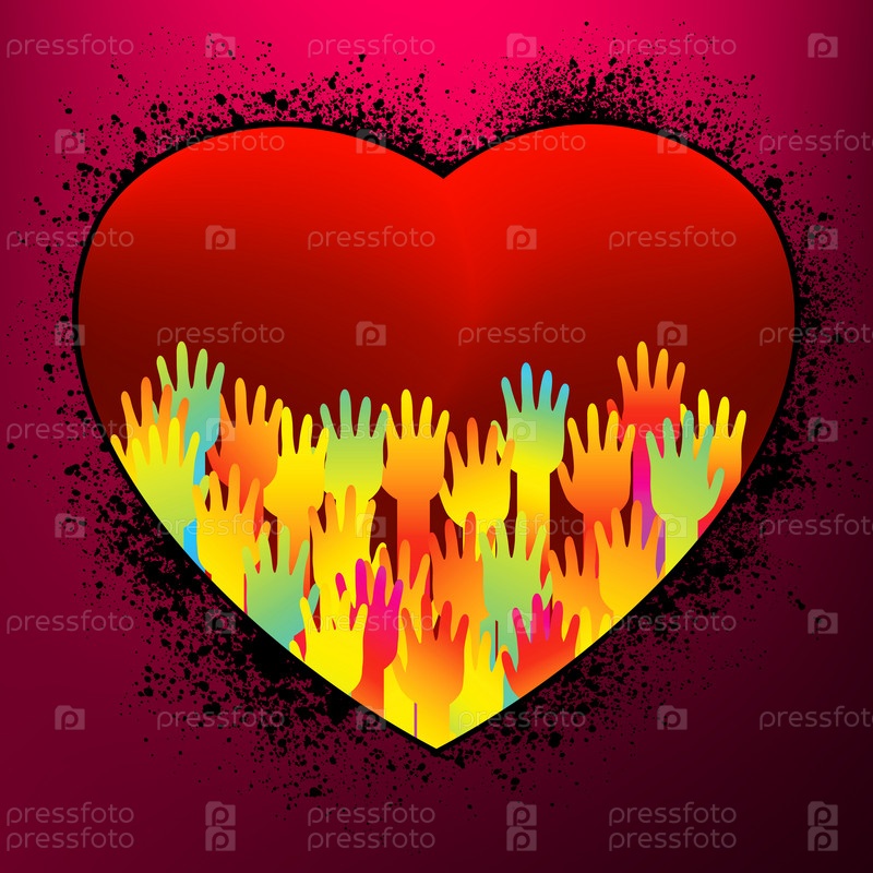 Красный фон с сердцем и цветными руками