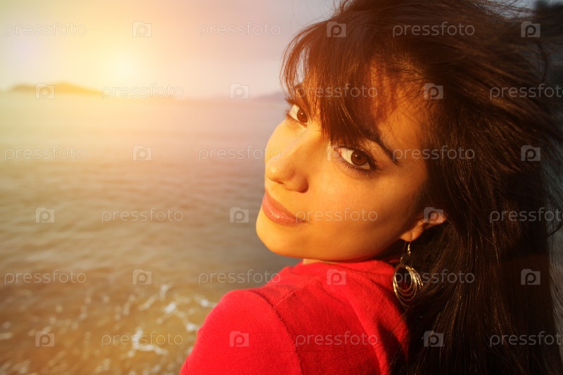 Молодая красивая женщина на пляже на закате крупным планом