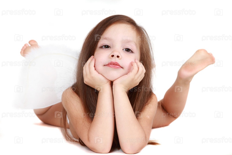 Маленькая девочка с ангельскими крыльями на спине мечтательно лежит