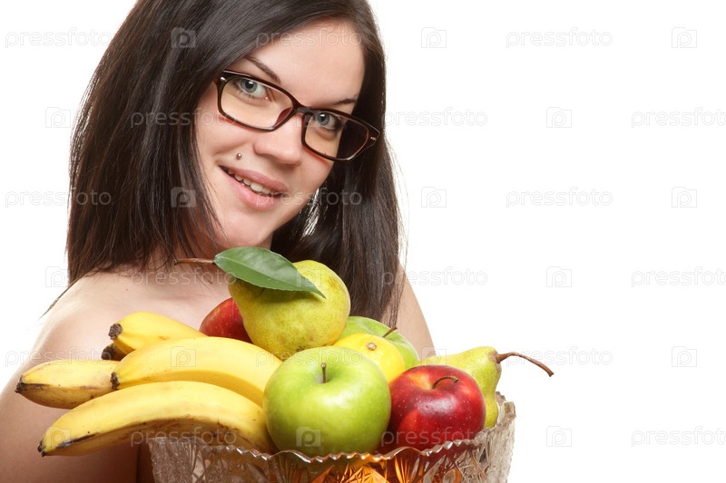 Темноволосая девушка в очках держит блюдо с фруктами