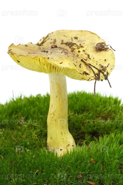 Рядовка зеленая на мхе, на белом фоне