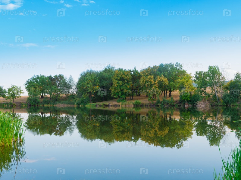 Отражение деревьев и неба в зеркальной глади озера. Пейзаж