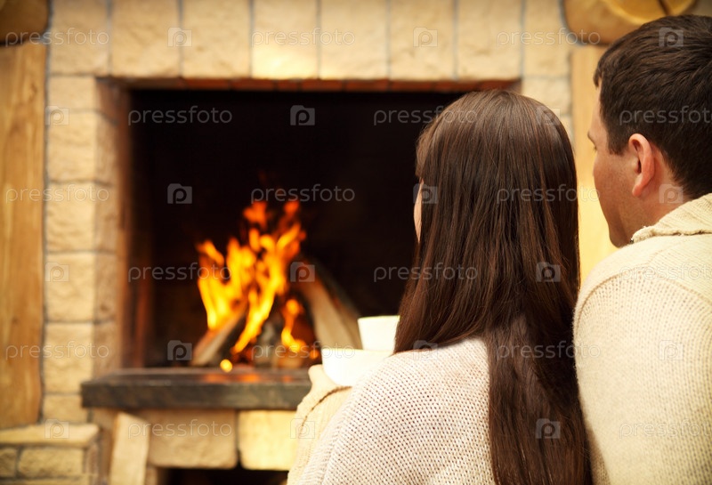 Пара с горячим шоколадом у камина