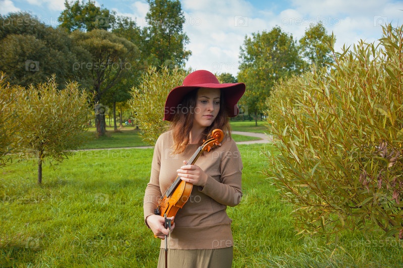Женщина со скрипкой позирует на свежем воздухе
