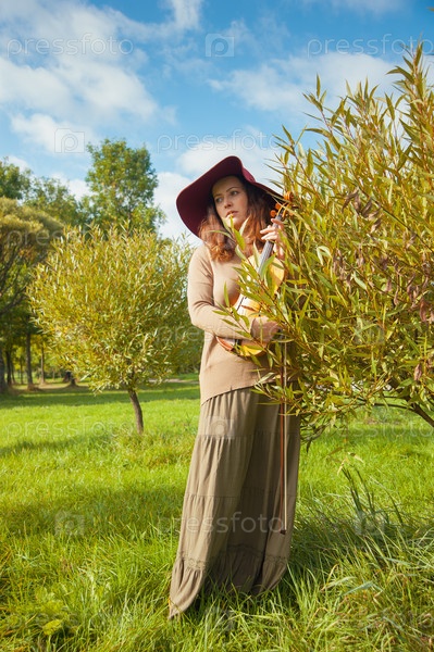 Женщина со скрипкой позирует на свежем воздухе