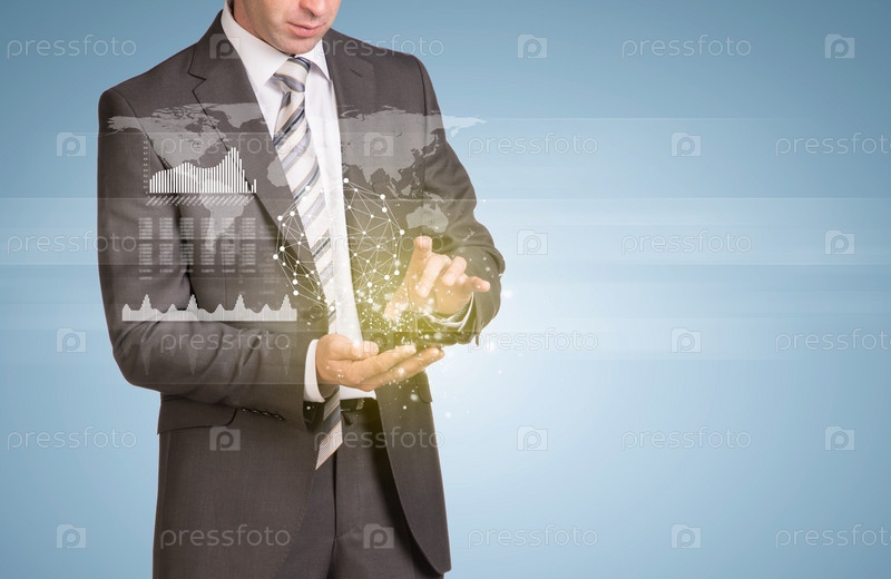 Бизнесмен со значками на виртуальном экране