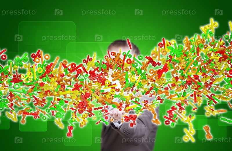 Бизнесмен в костюме держит поток знаков, цифр и процентов