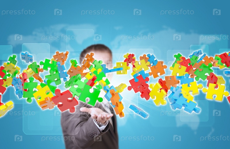 Бизнесмен в костюме держит поток пазлов