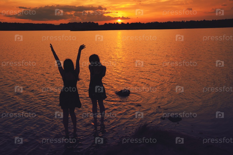 Две девушки на берегу на закате