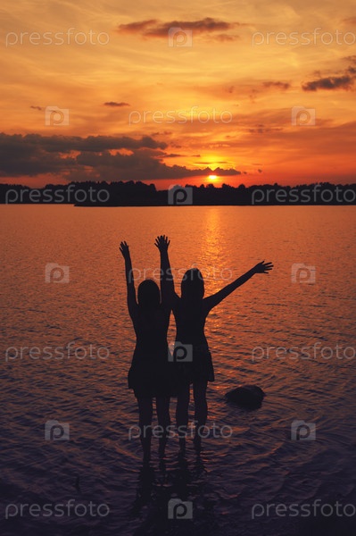 Две девушки на берегу на закате