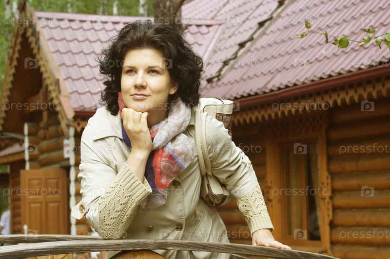 Молодая женщина в платке цветов российского флага на фоне деревянного дома