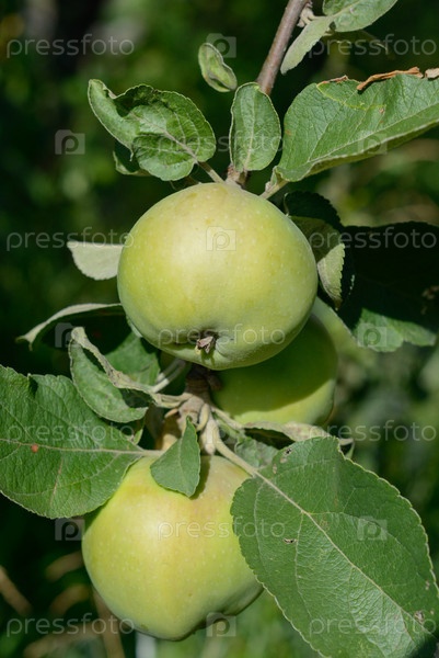Два зеленых яблока на ветке среди зеленой листвы
