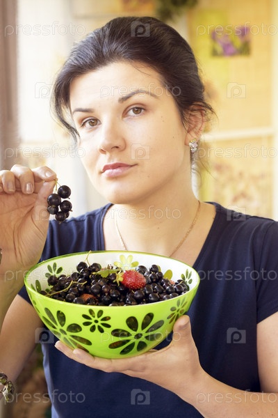 Молодая женщина с чашкой садовых ягод
