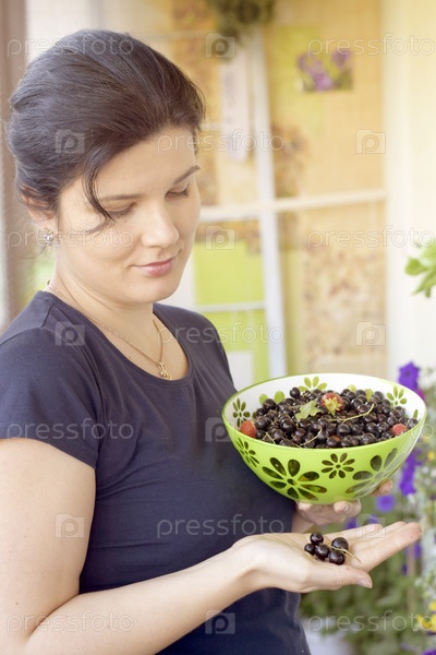 Молодая женщина с чашкой садовых ягод