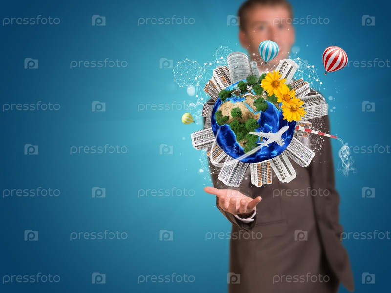 Бизнесмен держит Землю с постройками