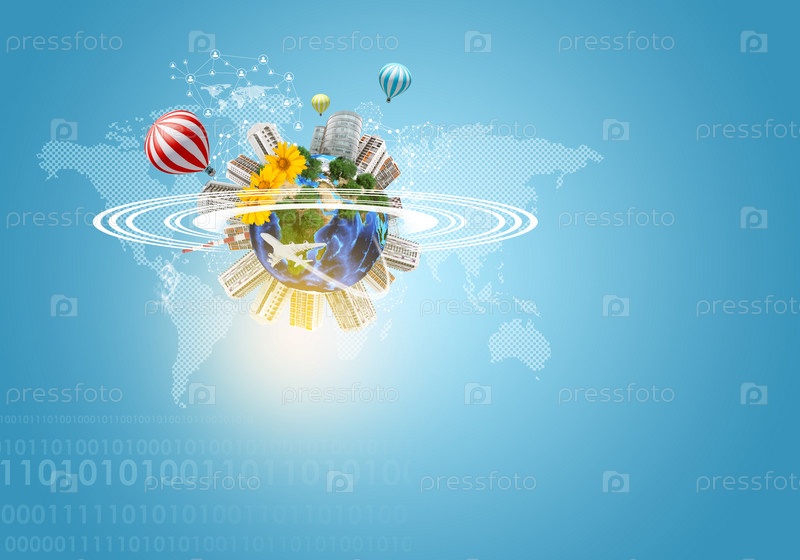Земля со зданиями, воздушным шаром, деревьями и самолетом