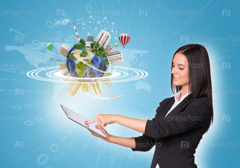 Женщина с планшетом и планетой Земля