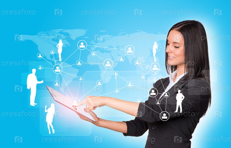 Женщина с планшетом и силуэтами деловых людей вокруг