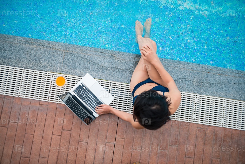 Женщина с ноутбуком у бассейна