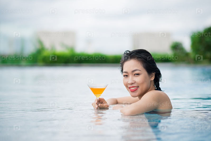 Женщина с коктейлем в бассейне