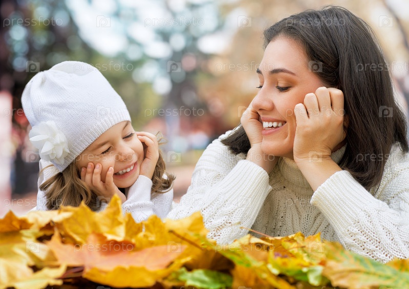 Мать с дочерью лежат на опавших листьях