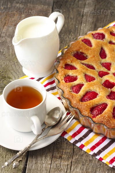 Клубничный пирог, чашка чая и молока