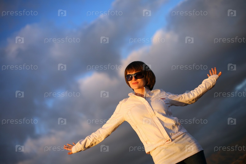 Молодая женщина в солнцезащитных очках на фоне облачного неба