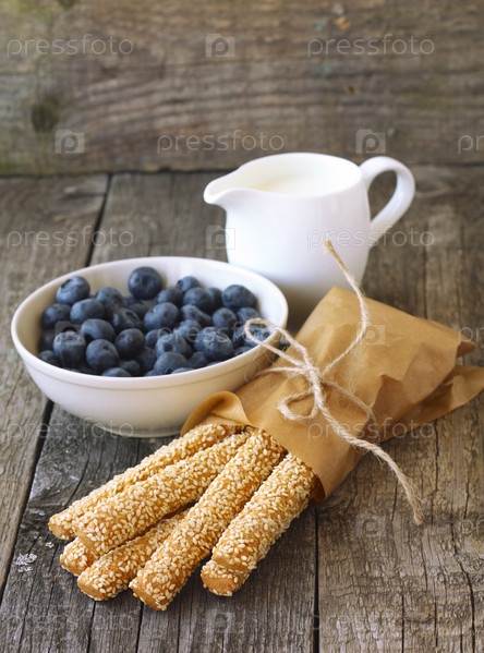 Кунжутные палочки, голубика и молоко на деревянном фоне