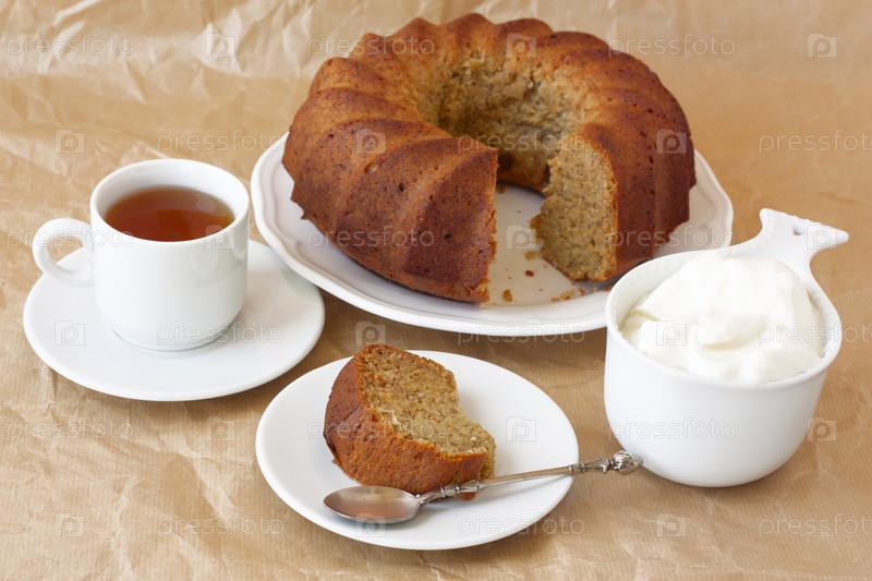 Домашний банановый торт, чашки чая и йогурт