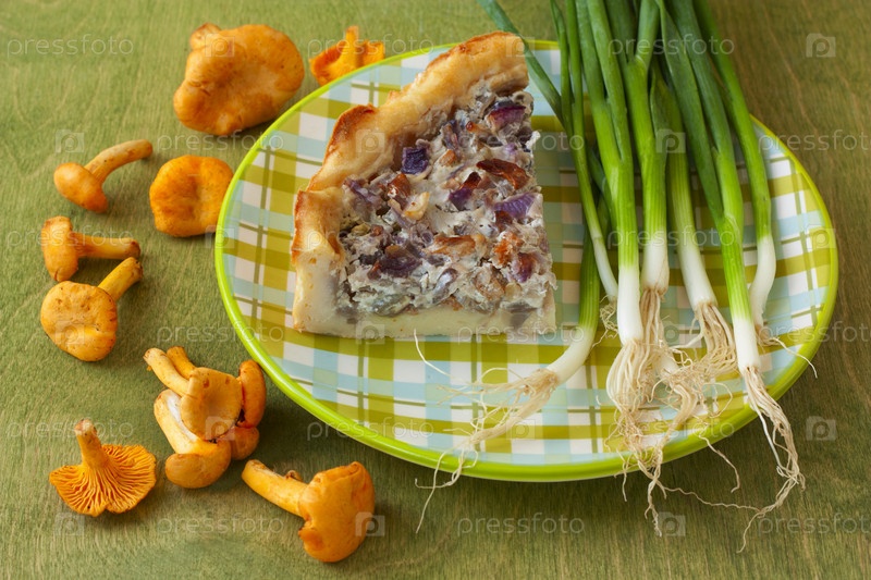 Кусок пирога с грибами, свежий лук и свежие грибы