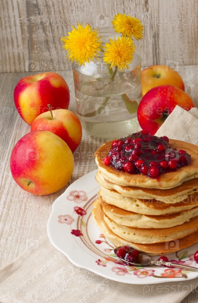Блины с брусничным вареньем и свежие яблоки