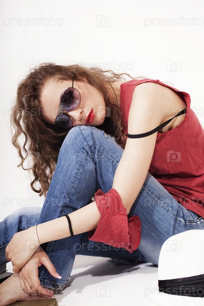 Брюнетка в красной футболке и синих джинсах на белом фоне