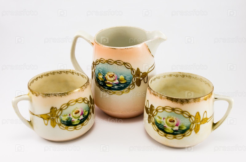 Кувшин и чашки на белом фоне