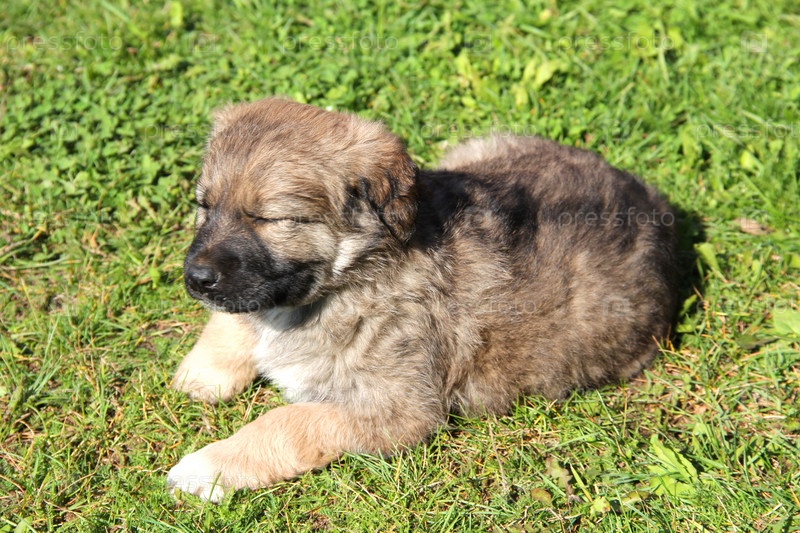 Щенок породы алабай лежит на траве