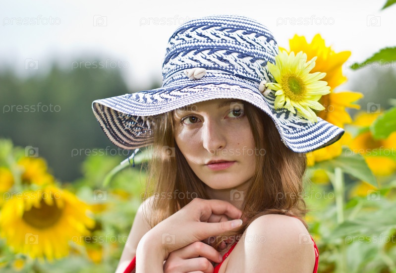 Портрет девушки в шляпе среди подсолнухов