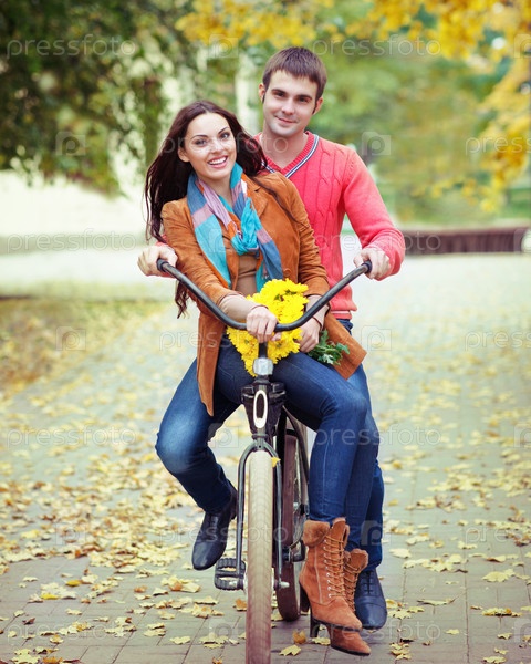 Счастливая пара с велосипедом в осеннем парке