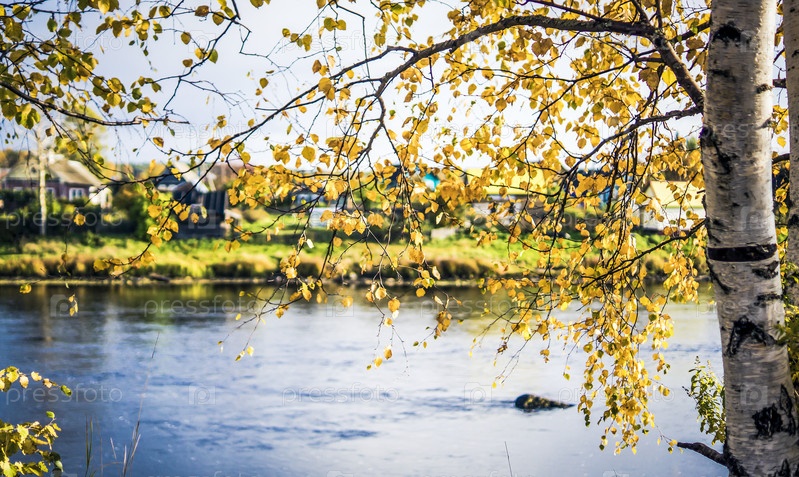 Березка осенью на фоне реки и деревенских домиков