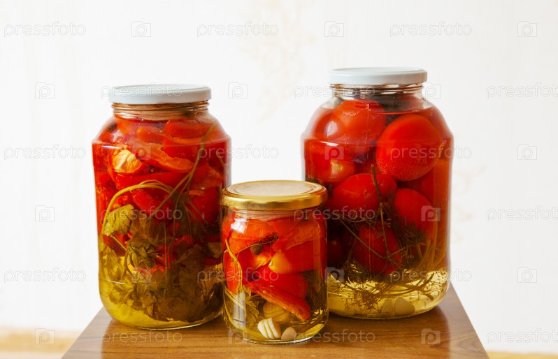 Стеклянные банки с маринованными помидорами
