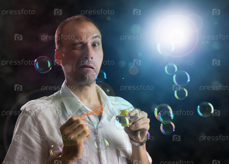 Человек и мыльные пузыри на темном фоне