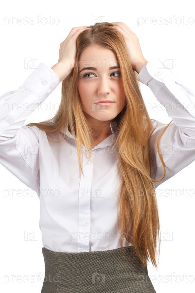 Портрет деловой женщины с головной болью, на белом фоне